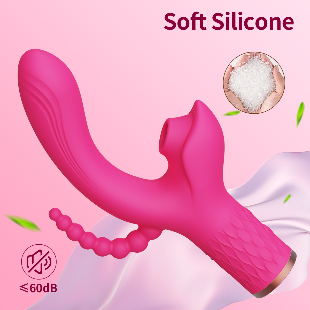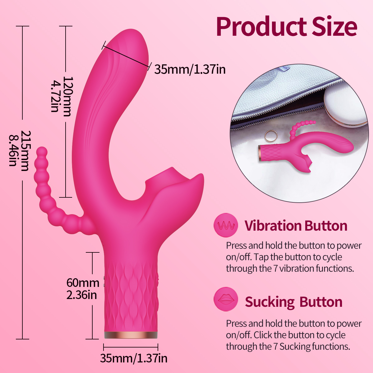 This 3-in-1 vibrator combines the three functions of clitoral sucking, G-spot vibration and anal plug vibration, which perfectly fulfills multiple needs at once and brings all-around sensual stimulation.
