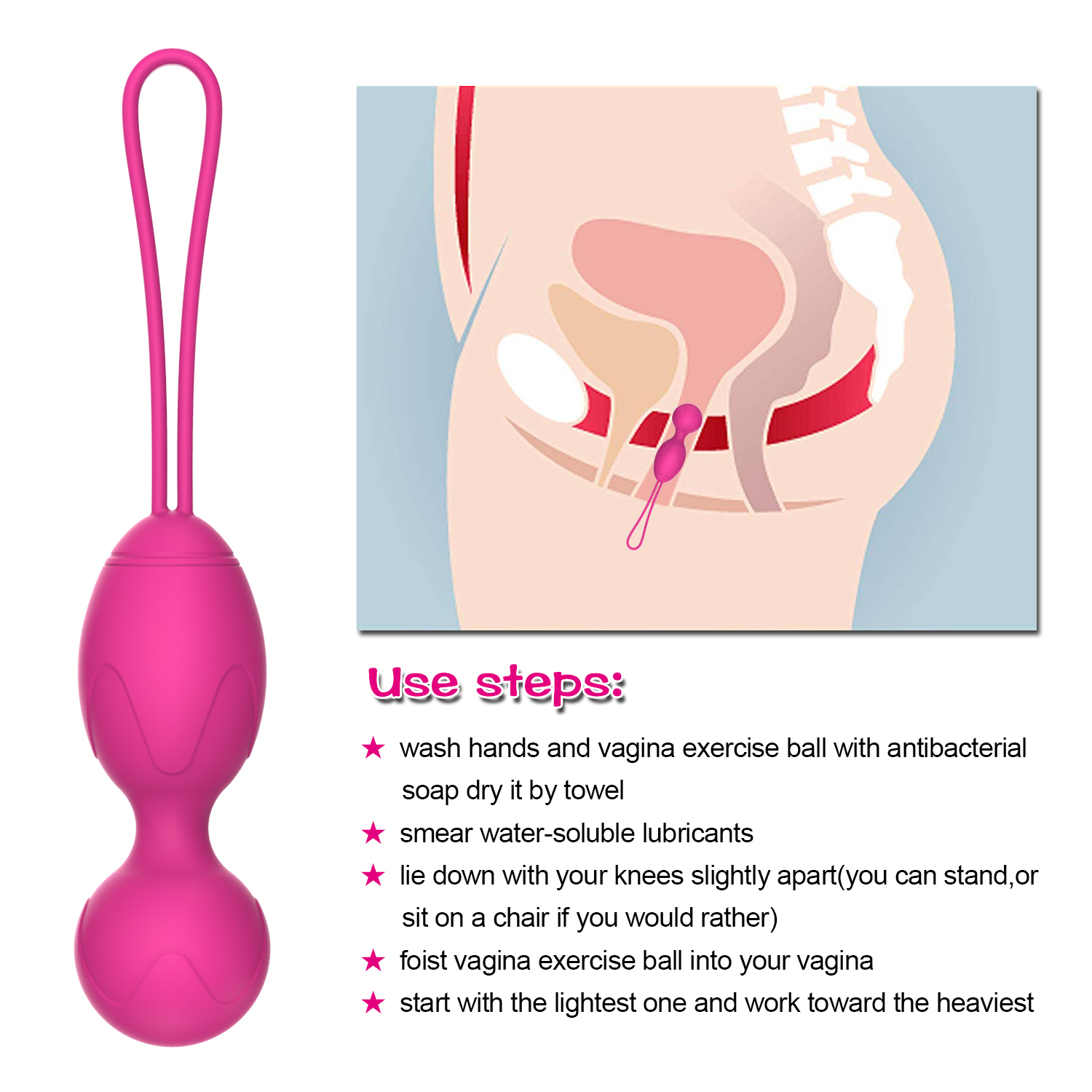Pelvic Floor Exercise: Insert the ball into the vagina and try to hold it in place with your pelvic muscles. The action of holding the ball strengthens the pelvic floor muscles, leading to improved bladder control and sexual health.
